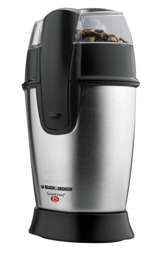 Black & Decker CBG100S Smartgrind Coffee Grinder, Stainless SteelFeatures: Stainless Steel Grinding Blades, Stainless Steel Bowl, Push-Button Pulse Control, Cord Storage, Lid Locking Security Feature Easy-touch pulse control quickly custom grinds your favorite coffee beans from coarse to fine. Pulse button and safety function add to precision and peace of mind. Stainless steel blades for consistent, outstanding performance. Holds 1/2 cup capacity and is 130 watts of power. Cord wrap adds to its convenience by leaving less mess and more counter space for you. |