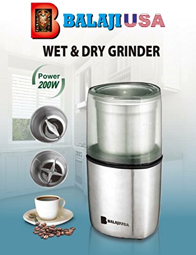 Balajiusa wet & dry grinder stainless steel 110 volts use in USA only, housing with 2 cups dry grinder for spices ,cofee beans,masalas wet grinder for chutneys,sauses etc